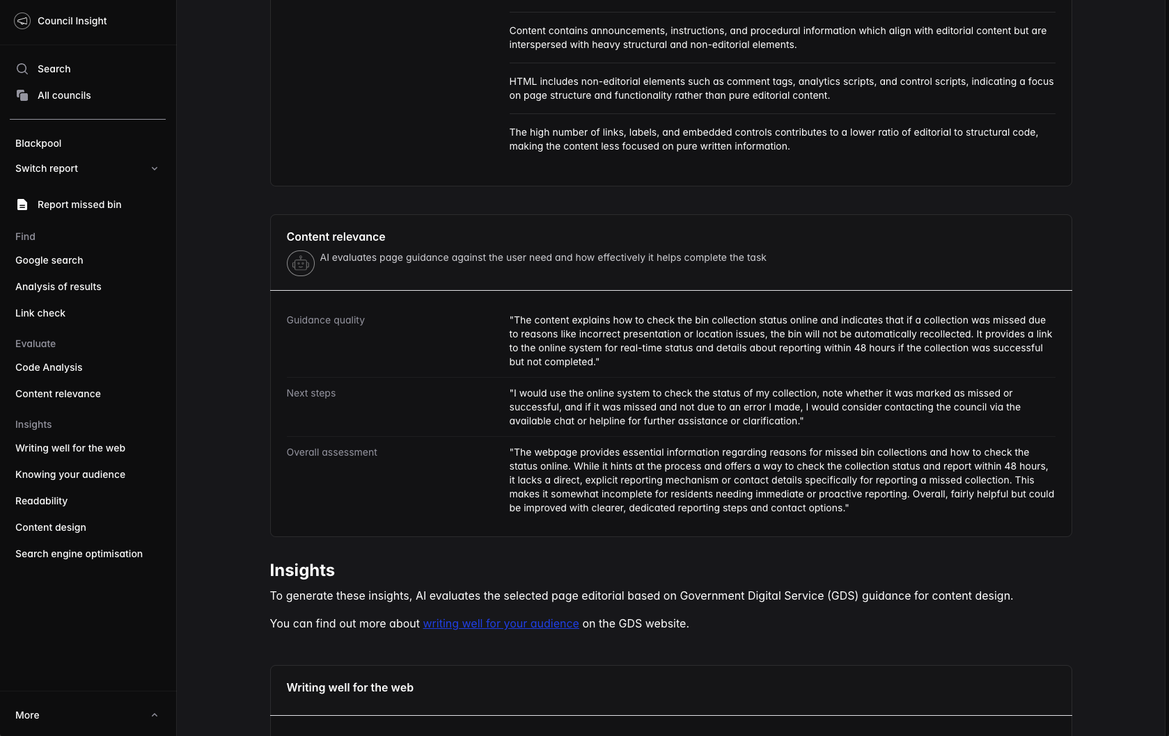 - Identify content that works and that doesn't with clear reporting and practical recommendations for improvement in line with Government Digital Service best practice.